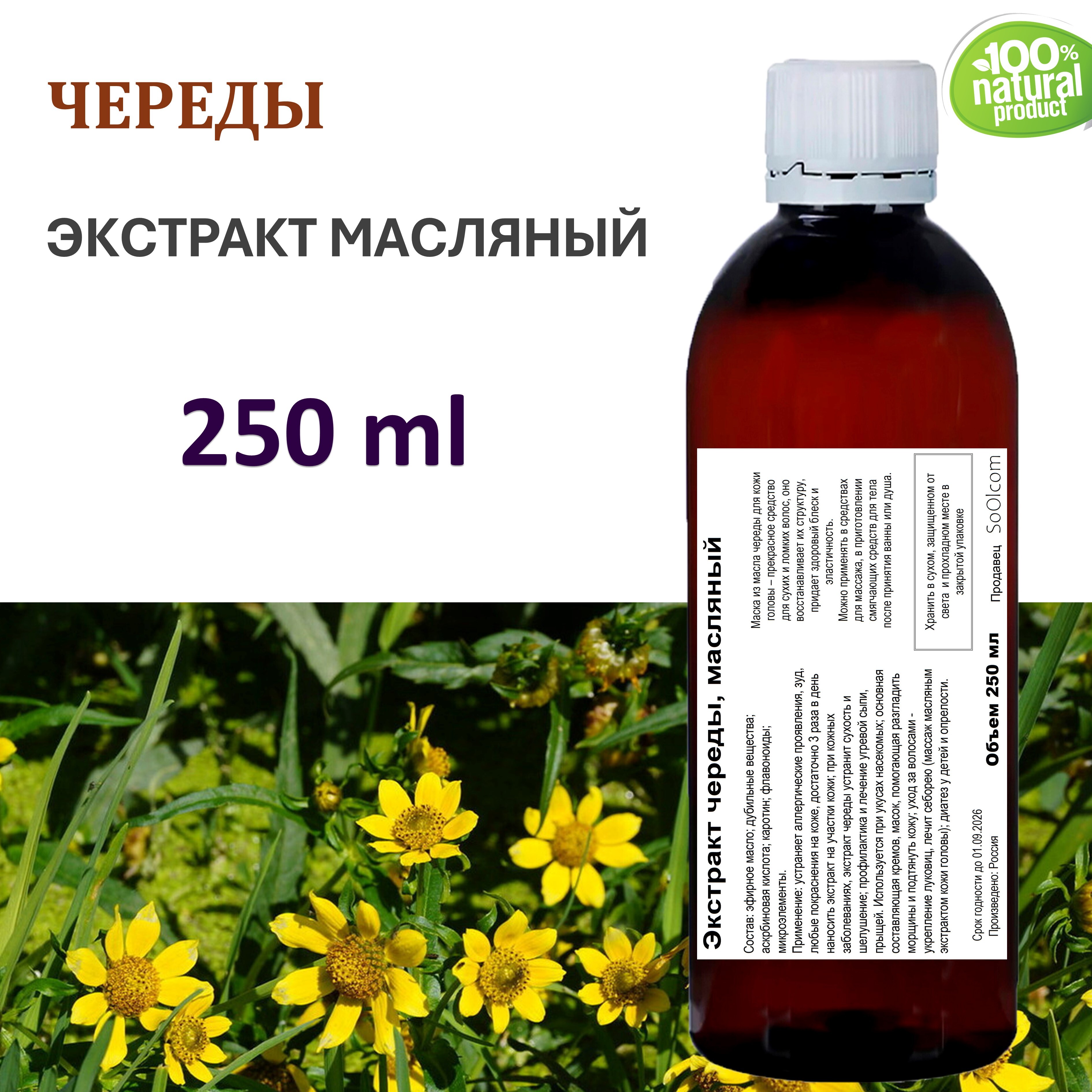 Применение: устраняет аллергические проявления, зуд, любые покраснения на коже, достаточно 3 раза в день наносить экстракт на участки кожи; при кожных заболеваниях, экстракт череды устранит сухость и шелушение; профилактика и лечение угревой сыпи, прыщей. Используется при укусах насекомых; основная составляющая кремов, масок, помогающая разгладить морщины и подтянуть кожу; уход за волосами - укрепление луковиц, лечит себорею (массаж масляным экстрактом кожи головы); диатез у детей и опрелости.