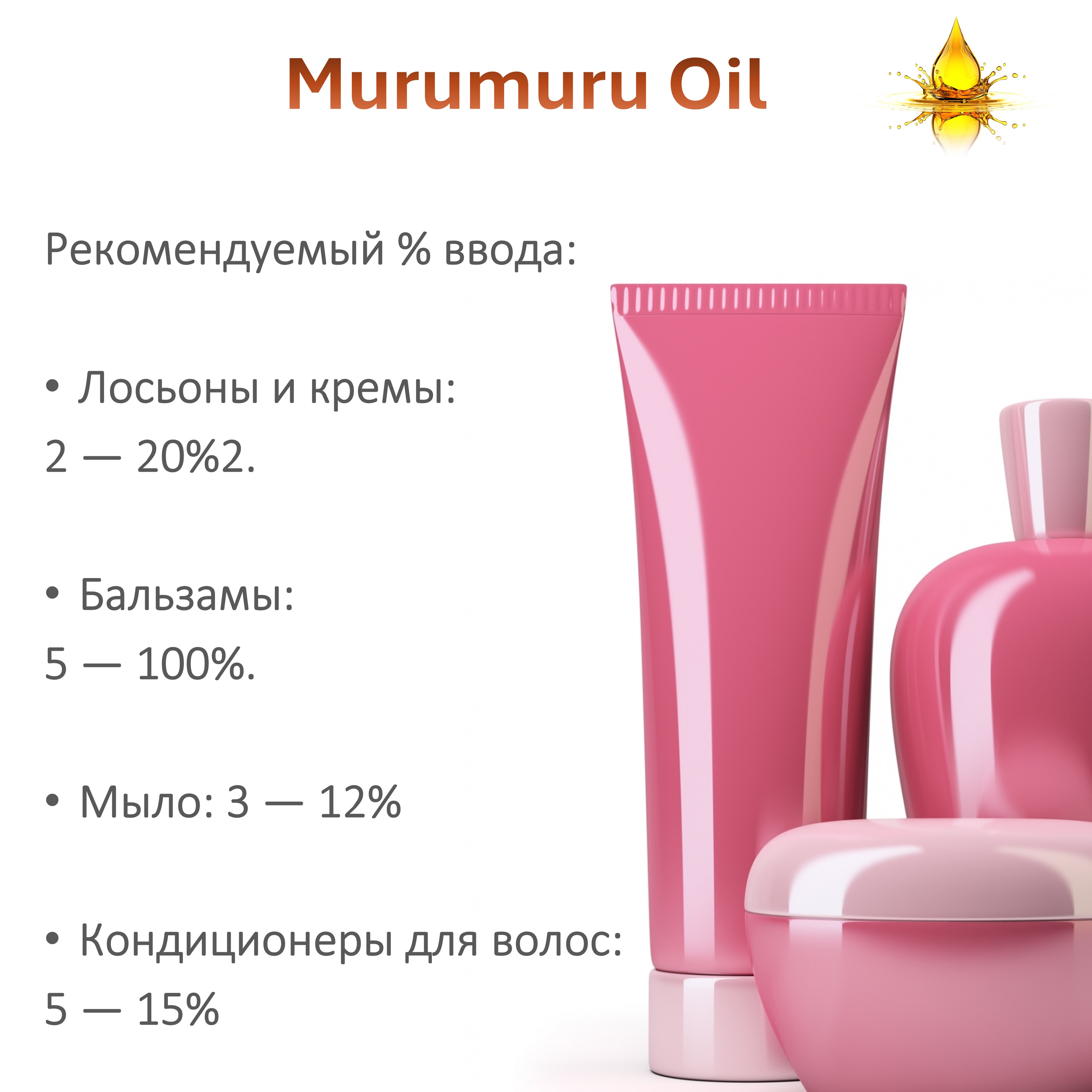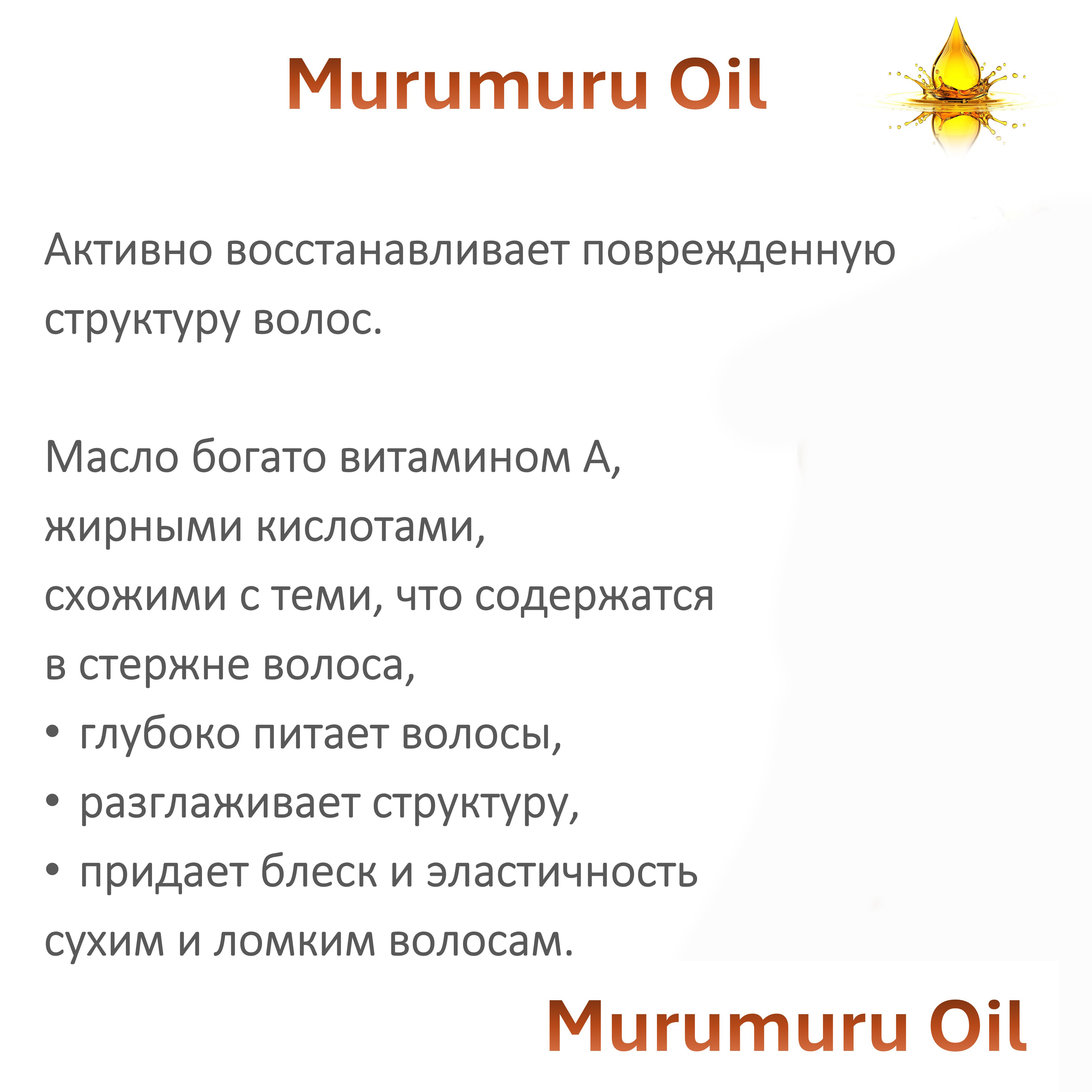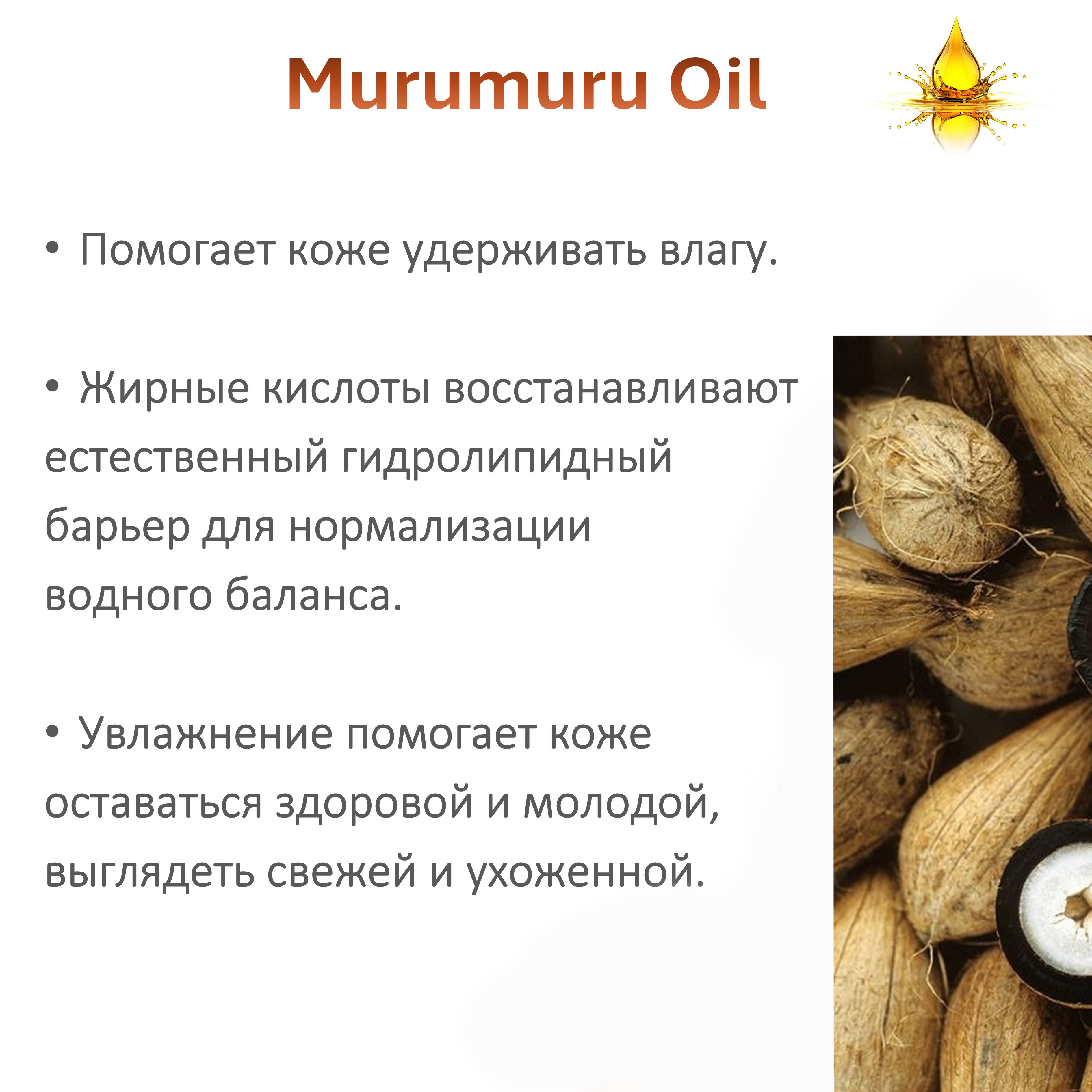 - Масло мурумуру быстро впитывается как в кожу, так и в волосы. Его легко использовать как самостоятельное средство (например, бальзам для губ или масляная аппликация для кожи лица) и как базовое масло для обогащения натурального крема, маски или бальзама для волос.
