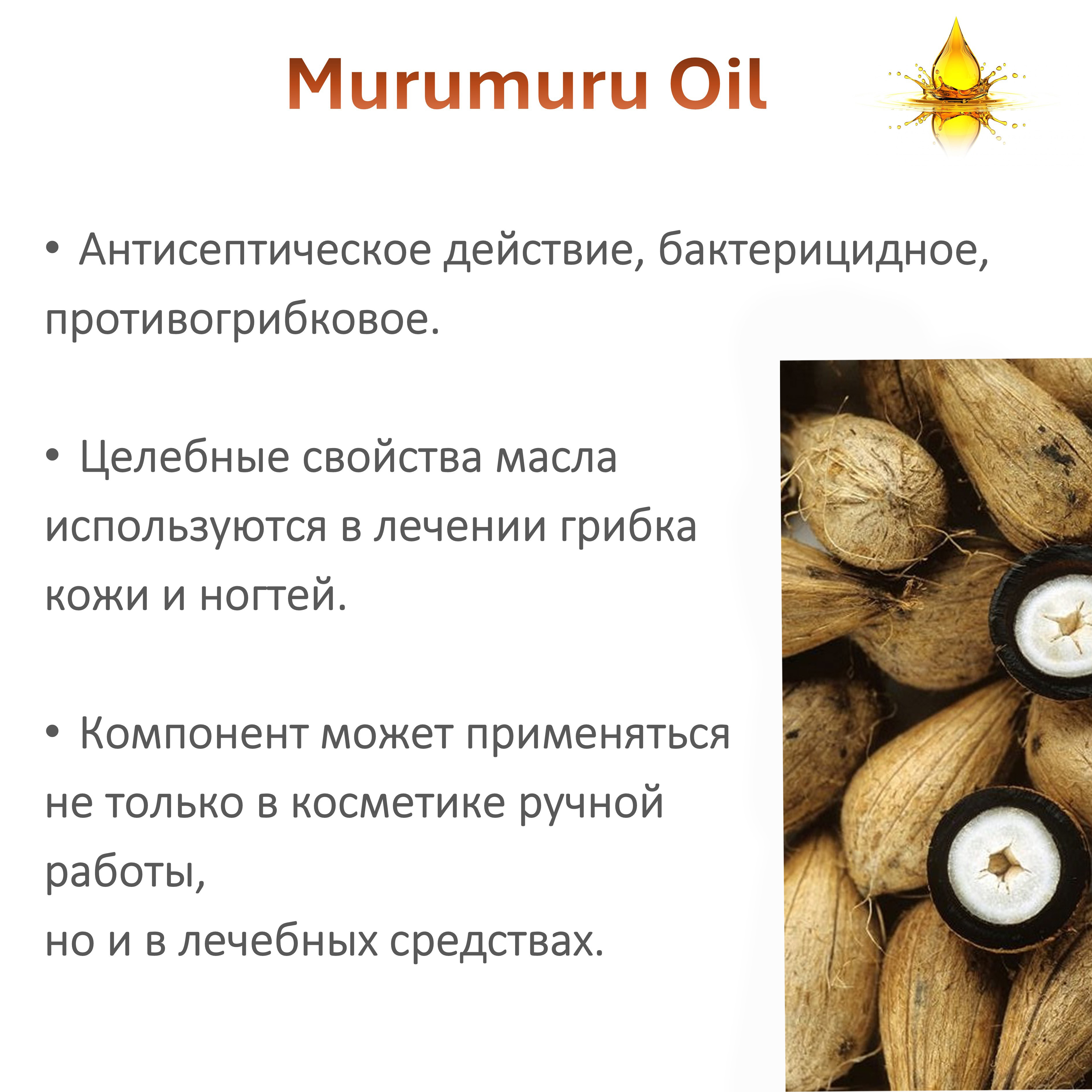 - Целебные свойства масла мурумуру используются в лечении грибка кожи и ногтей.