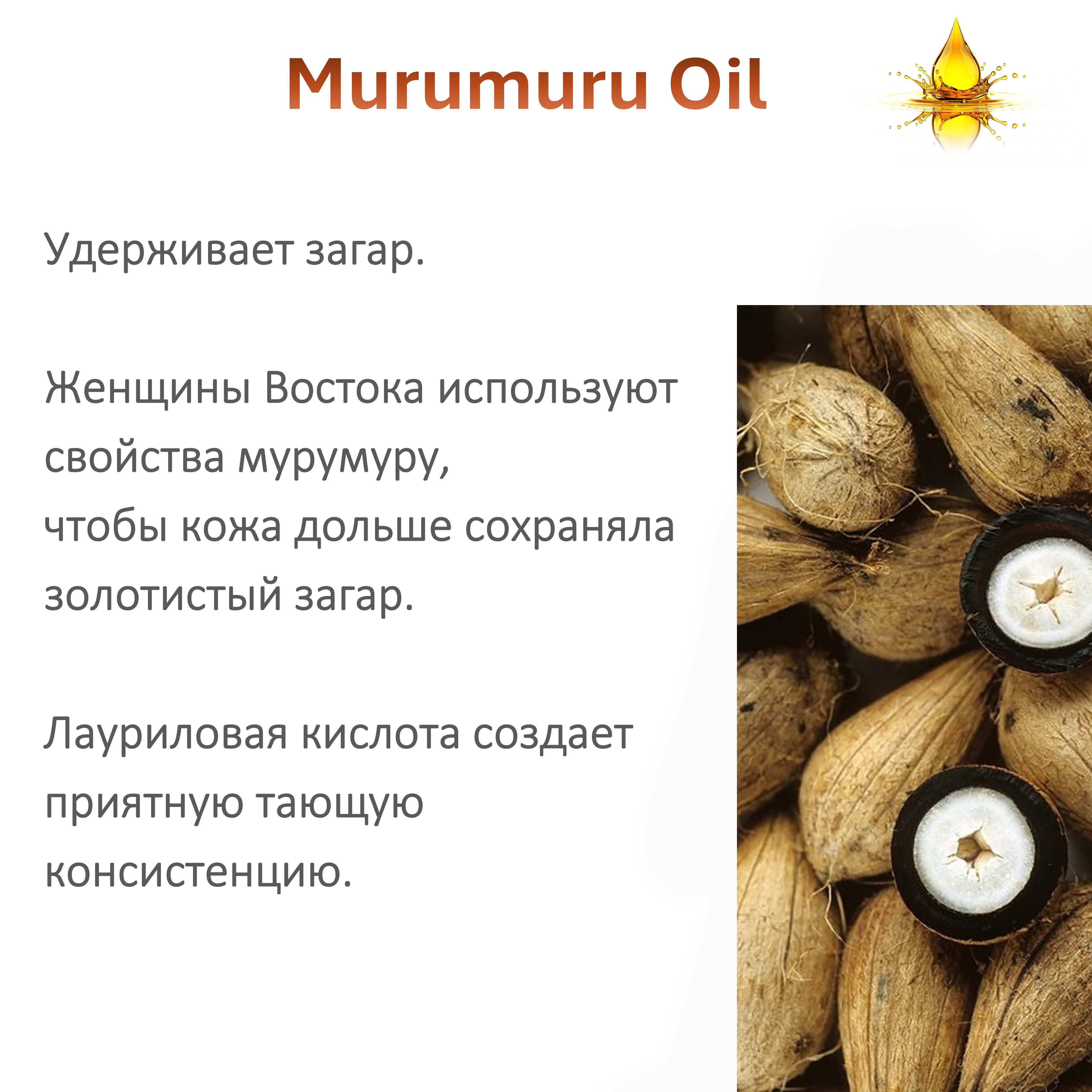 - Удерживает загар. Женщины Востока используют свойства мурумуру, чтобы кожа дольше сохраняла золотистый загар. Лауриловая кислота создает приятную тающую консистенцию.