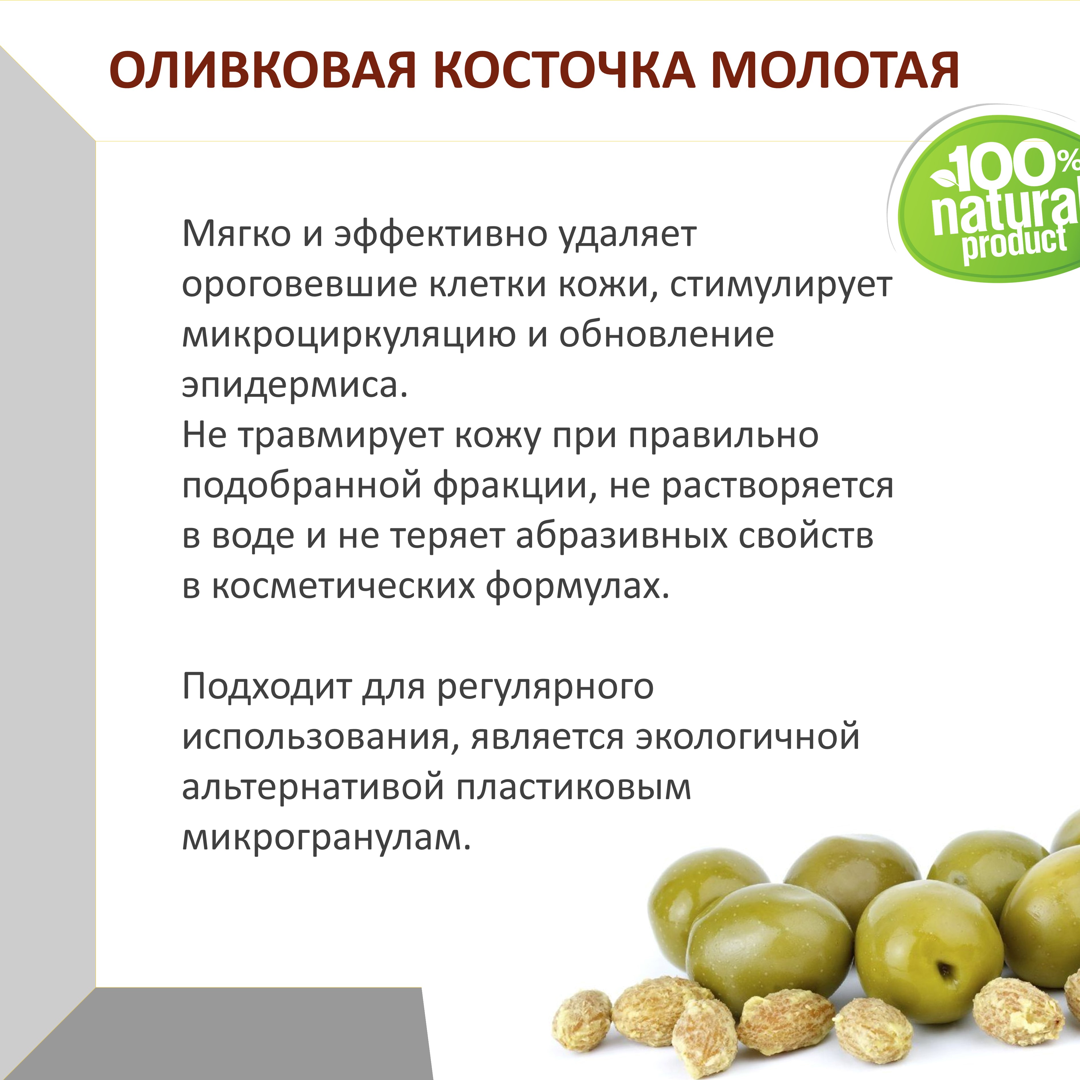 Абразив оливковой косточки — это натуральный растительный эксфолиант, получаемый путем механического измельчения и фракционирования косточек плодов оливы (Olea europaea).