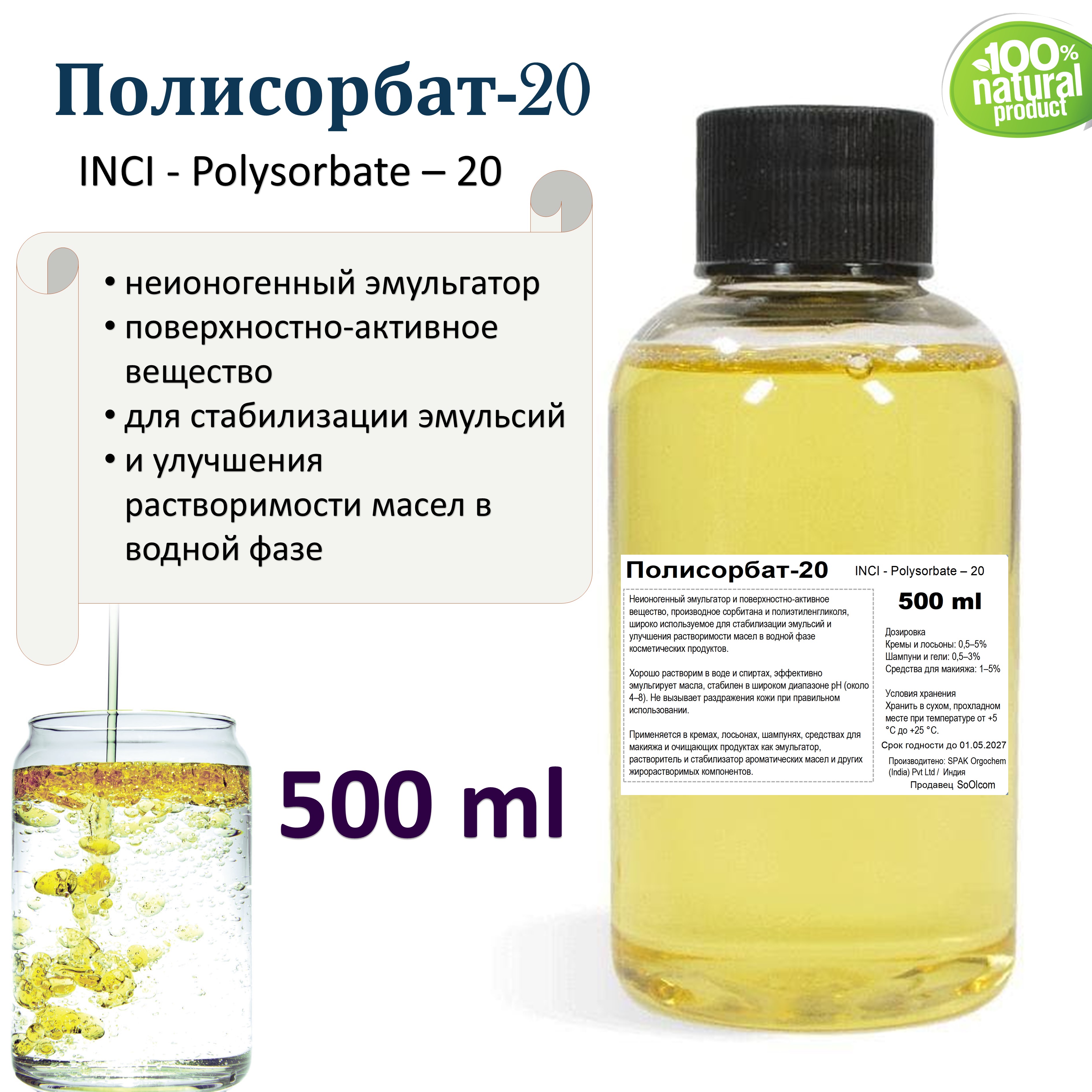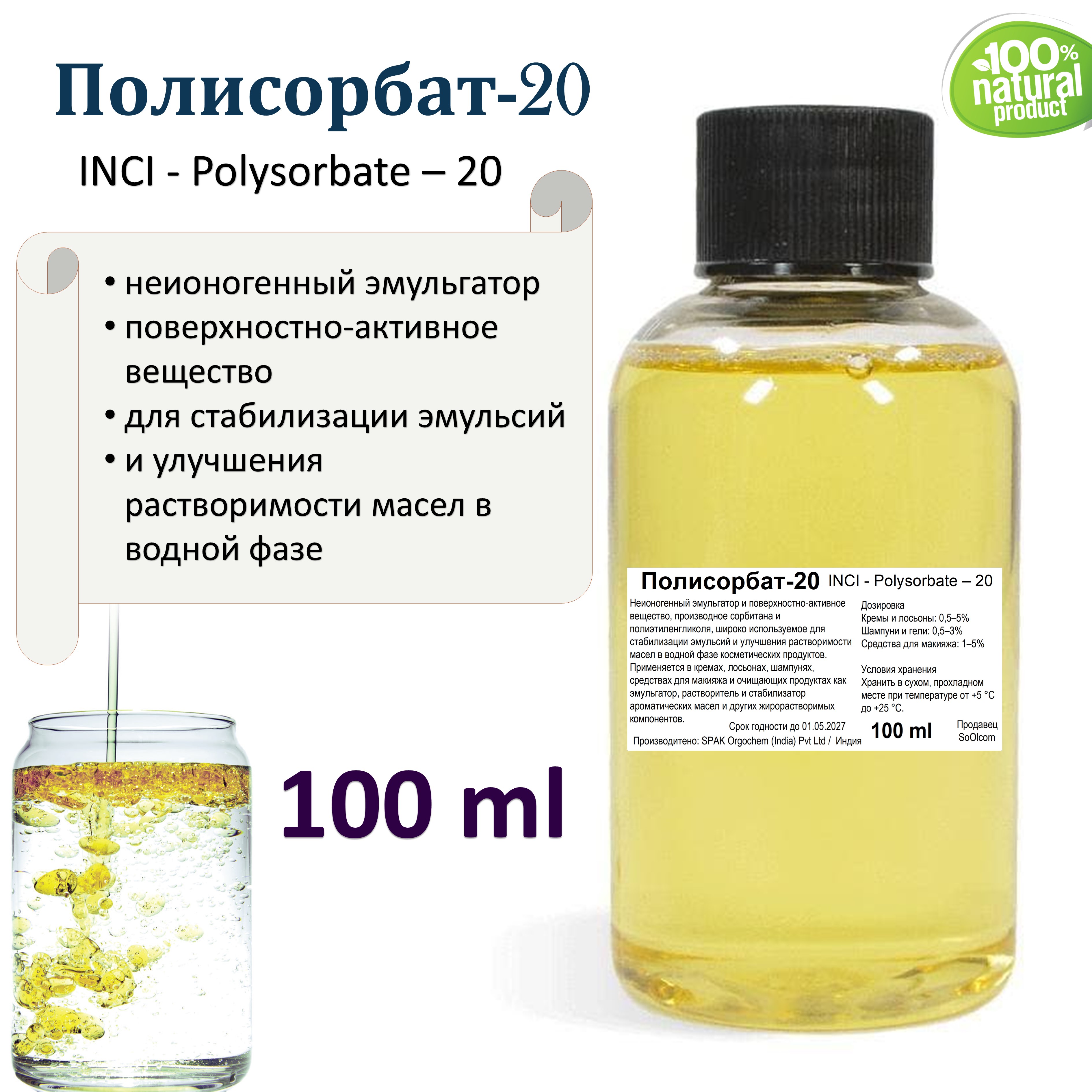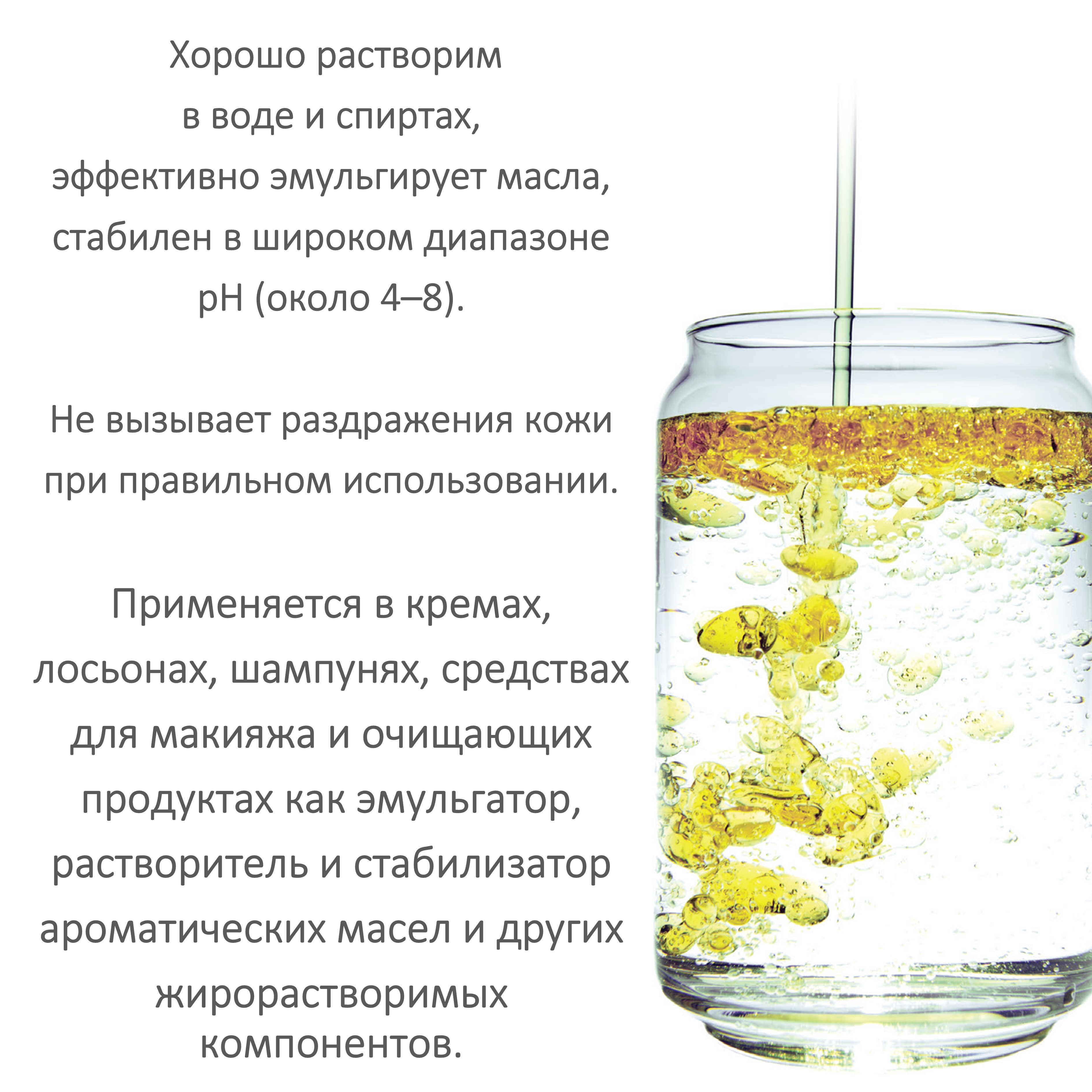 Бесцветная или светло-желтая вязкая жидкость без запаха или с легким характерным запахом. Хорошо растворим в воде и спиртах, эффективно эмульгирует масла, стабилен в широком диапазоне pH (около 4–8). Не вызывает раздражения кожи при правильном использовании.