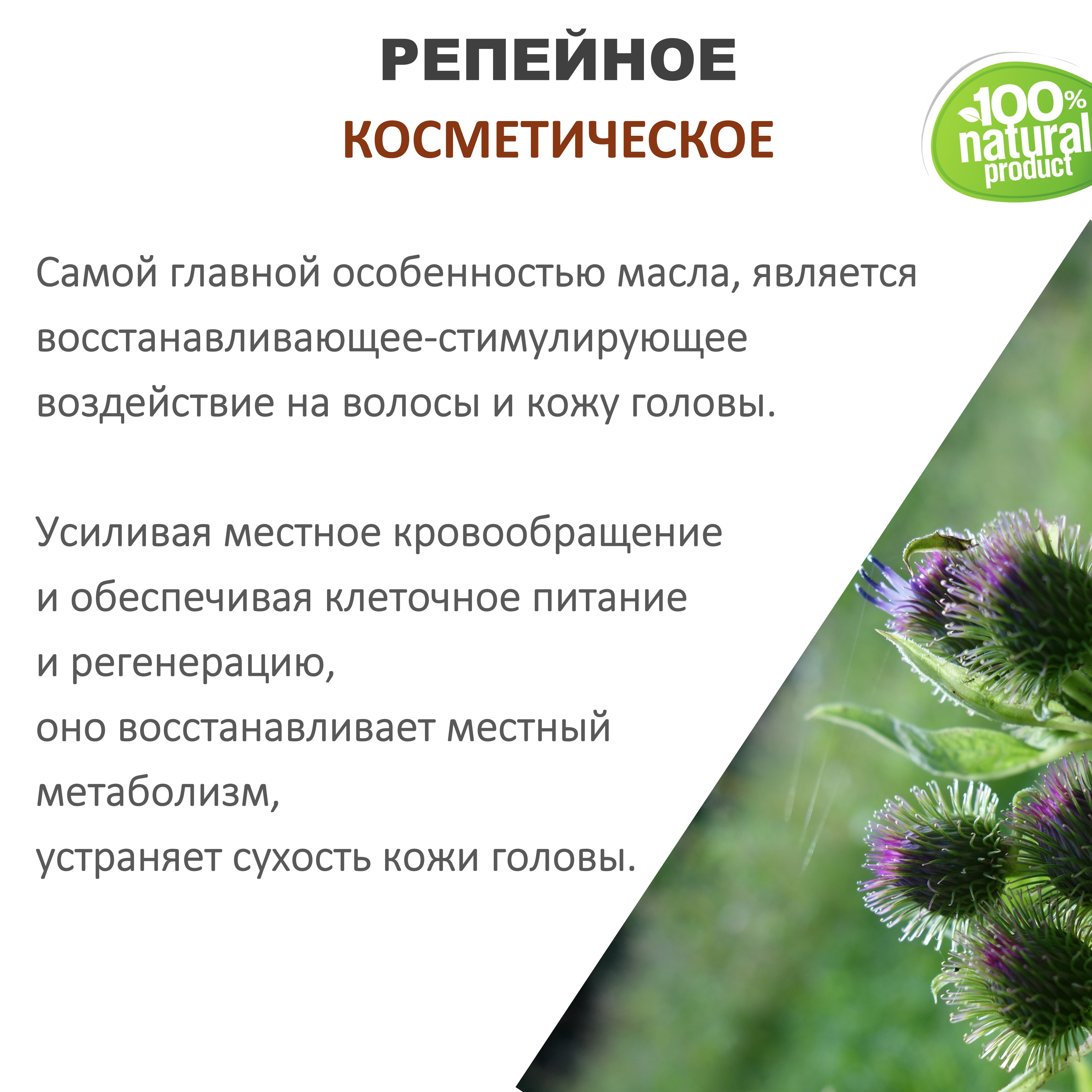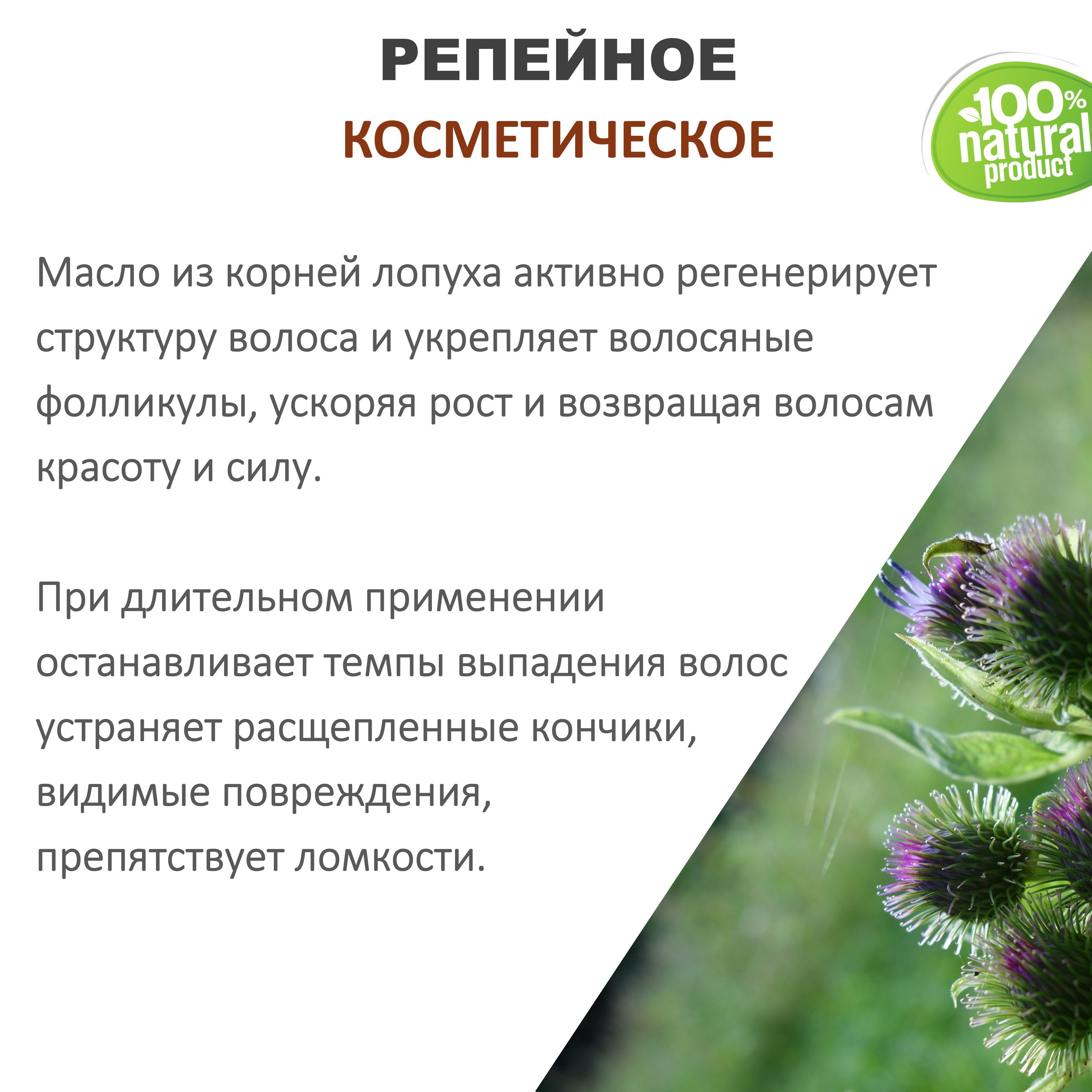 Масло из корней лопуха активно регенерирует структуру волоса и укрепляет волосяные фолликулы, ускоряя рост и возвращая волосам красоту и силу. При длительном применении останавливает темпы выпадения волос (после первых процедур наблюдается обратный эффект, но со временем он проходит и позитивное влияние становится более очевидным), устраняет расщепленные кончики, видимые повреждения, препятствует ломкости.