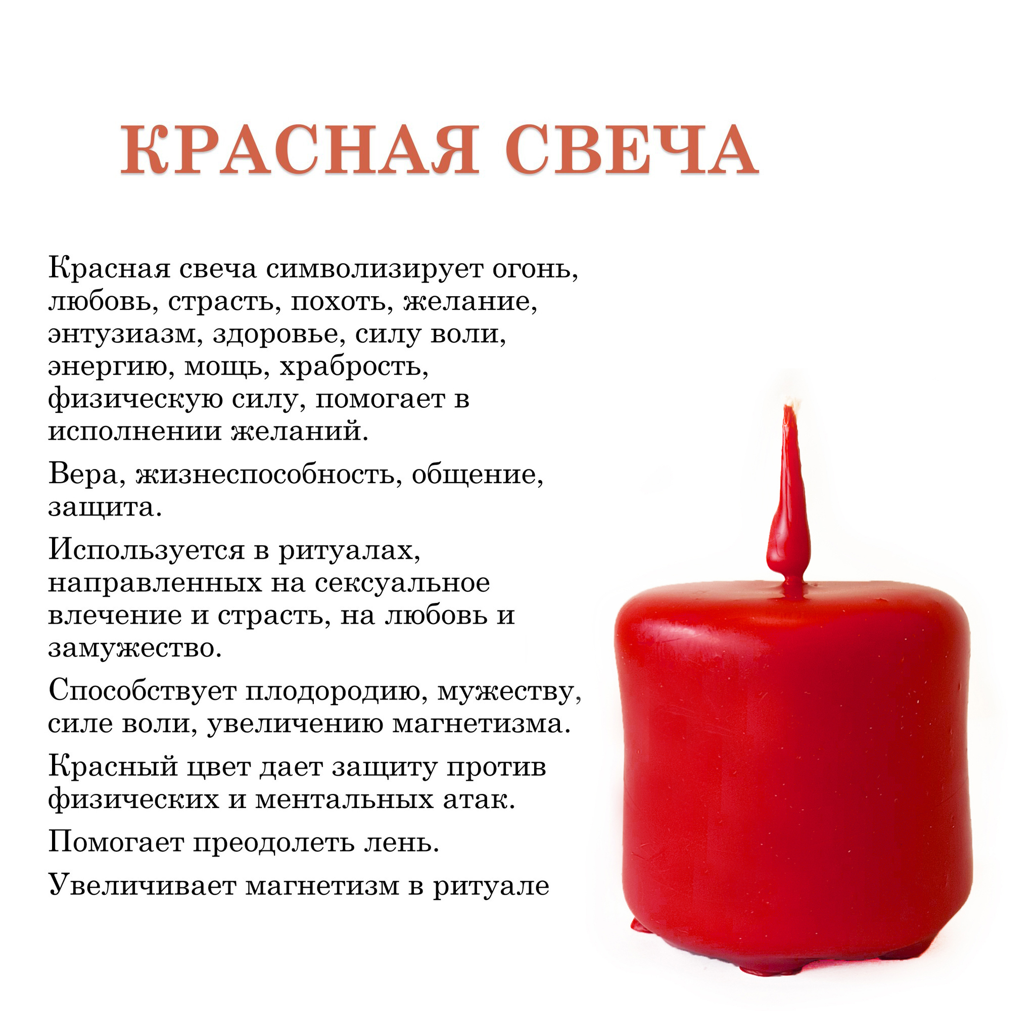 Такая свеча часто используют в любовных заклинаниях и вожделениях, так как она считается афродизиаком и приносит удачу в любовных делах